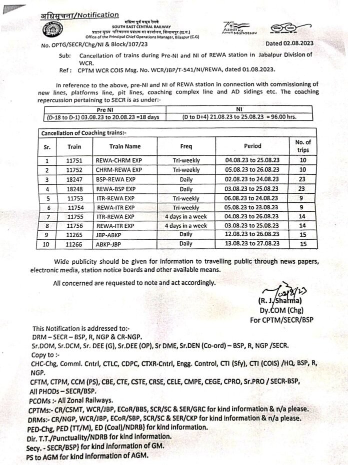 दक्षिण पूर्व मध्य रेलवेव प्रधान मुख्य परिचालन प्रबंधक बिलासपुर द्वारा रीवा से इतवारी और बालाघाट से इतवारी, गोंदिया से कटंगी ट्रेनो को कार्य के चलते बंद किया है। बिलासपुर जोन द्वारा ट्रेनो को कुछ समयावधि के लिए बंद किये जाने के पीछे इंटरलॉकिंग और मैटनेंस कार्य को वजह बताया गया है। जहां रीवा स्टेशन पर निर्माणाधीन 3-4-5 नंबर के नए प्लेटफॉर्म के लाइनों को 1 नंबर प्लेटफॉर्म एवं 2 नम्बर प्लेटफार्म के साथ जोड़ने के इंटरलॉकिंग कार्य के चलते रीवा से आगामी 24 अगस्त तक ट्रेनों को रद्द किया गया है। जिसमें रीवा से व्हाया बालाघाट होकर जाने वाली रीवा-इतवारी ट्रेनो के 9 फेरे बंद रहेंगे। जबकि बालाघाट से इतवारी 3 दिन, ट्रेन क्रमांक 07805 एवं 07806 गोंदिया से कटंगी एवं कटंगी से गोदिया 3 दिन तथा ट्रेन क्रमांक 07809 एवं 07810 गोंदिया से कटंगी एवं कटंगी से गोंदिया दो दिनों तक बंद रहेगी। जिस के आदेश भी रेलवे द्वारा जारी कर दिए गए हैं वहीं रेलवे ने इसकी सूचना संबंधित रेलवे स्टेशनों में पहुंचा दी है। ताकि ट्रेनों के रद्द होने से यात्रियों को किसी भी प्रकार की परेशानी का सामना ना करना पड़े।