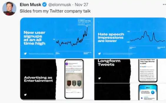 एलन मस्क ने ट्विटर को बदलने के लिए बनाए गए एक प्रेजेंटेशन की कुछ स्लाइड्स शेयर कर इस बात की जानकारी दी है।