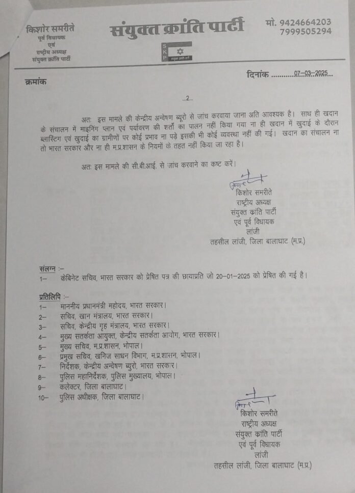 भारत सरकार कैबिनेट सचिव को लिखे गए इस पत्र में राष्ट्रीय अध्यक्ष श्री समरीते ने इस बात का उल्लेख किया कि बालाघाट जिले में तहसील तिरोड़ी के ग्राम पौनिया में मेसर्स सुखदेव प्रसाद गोयनका को खसरा न. 523/1, 523/2, 523/3 में 31.844 हेक्टेयर का खनिज पट्टा दिनांक 23-11-2004 को खान मंत्रालय द्वारा स्वीकृत किया गया। इस खदान का संचालन माईनिंग प्लान तथा अनुबंध की शर्तों का उल्लंघन कर पर्यावरण मंत्रालय की शर्तों का उल्लंघन कर किया जा रहा है। इसी क्रम में मेसर्स सुखदेव प्रसाद गोयनका की संचालक गुंजन गोयनका तथा इसके मुनीम शैलेन्द्र पटले ने खदान से लगी भूमि खसरा नम्बर 561/1, 561/2, 561/3 में से 80 डिसमिल कृषि भूमि में 2017 से 2025 तक 200 टन बारूद का उपयोग कर ब्लास्टिंग कर 500 करोड़ का मेंगनीज खोदकर बिकी कर दिया। अपनी भूमि को बचाने कृषक परिवार राकेश टेंभरे एवं सालिकराम टेंभरे ने 10 दिनों तक अनशन किया जबकि भूमि स्वामी दुलीचंद टेंभरे की भूमि को नहीं बचाने के कारण सदमे से मौत हो गयी। इस मामले में कलेक्टर जिला बालाघाट, पुलिस अधीक्षक जिला बालाघाट कोई कार्यवाही नहीं कर रहे हैं। बालाघाट जिला पूर्णतः नक्सल प्रभावित है।जहां बिना पुलिस की अनुमति के खदान में बारूद का उपयोग नहीं कर सकते। फिर किसानों की 523/1, 523/2,