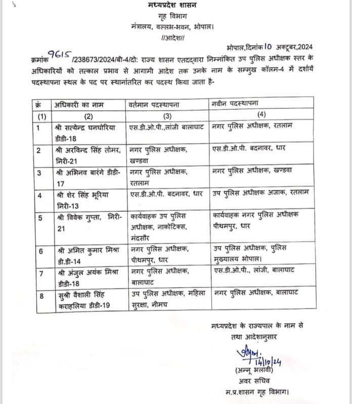 मध्य प्रदेश शासन गृह विभाग अपर सचिव ने पुलिस अधीक्षक स्तर के अधिकारियों के स्थानांतरण सूची जारी की है। सोमवार देर शाम जारी की गई इस स्थानांतरण सूची में उप पुलिस अधीक्षक स्तर के 08 अधिकारियों को इधर से उधर किया गया है।जिसमें बालाघाट सीएसपी अंजुल अयंक मिश्रा और लांजी एसडीओपी सत्येंद्र घनघोरिया के नाम का भी समावेश है। मध्य प्रदेश शासन गृह विभाग अपर सचिव अन्नू भलावी द्वारा जारी की गई इस स्थानांतरण सूची के अनुसार नगर पुलिस अधीक्षक बालाघाट अंजुल अयंक मिश्रा का स्थानांतरण, लांजी एसडीओपी के पद पर किया गया है।तो वहीं लांजी एसडीओपी सत्येंद्र घनघोरिया का स्थानांतरण रतलाम में नगर पुलिस अधीक्षक के रूप में किया गया है। इसी तरह नीमच में महिला सुरक्षा उप पुलिस अधीक्षक के पद पर पदस्थ सुश्री वैशाली सिंह का स्थानांतरण बालाघाट कर उन्हें नगर पुलिस अधीक्षक बनाया गया है।जारी की गई इस स्थानांतरण सूची के अनुसार अब बालाघाट नगर पुलिस अधीक्षक अंजुल अयंक मिश्रा लांजी में एसडीओपी का पद संभालेंगे। तो वही नीमच से स्थानांतरित की गई उप पुलिस अधीक्षक वैशाली सिंह बालाघाट में नगर पुलिस अधीक्षक के पद का निर्वाहन करेंगी।