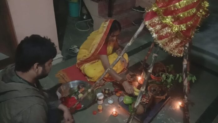 घर आंगन में मंडप सजाकर की गई पूजा अर्चना