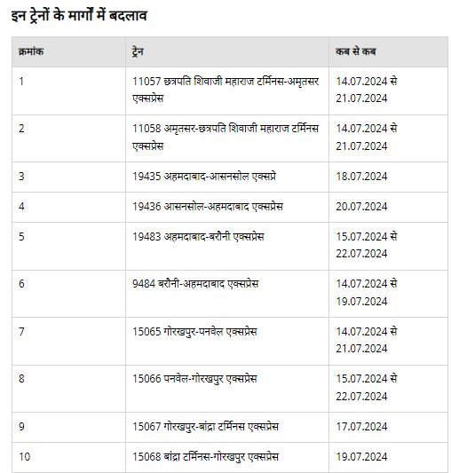 एमपी रेल प्रशासन द्वारा जारी प्रेस रिलीज में मध्य रेल के भुसावल मंडल के भुसावल-खंडवा डिवीजन के बीच गेज में बदलाव और खंडवा यार्ड रीमॉडलिंग का काम किया जा रहा है। इन ट्रेनों का अपनी निर्धारित तारीखों में शुरूआती स्टेशन से मार्ग परिवर्तित किया गया है।